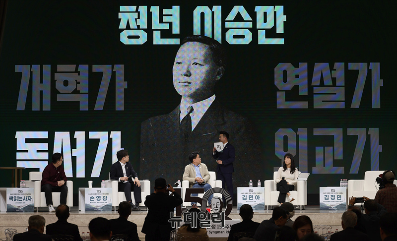조평세 1776연구소 대표, 손영광 바른청년연합대표, 김민아 빌드업코리아 대표, 책읽는사자 사자그라운드 대표가 25일 오후 서울 중구 한국자유총연맹에서 '우남 이승만 세기를 넘어 세대를 잇다'를 주제로 열린 이승만 대통령 탄생 150주년 기념행사에서 청년세대 원탁회의를 진행하고 있다.이날 기념행사는 학술회의, 청년세대와 미래세대 원탁회의로 진행된다. 학술회의 발표는 이영훈 전 서울대 교수, 김명섭 연세대 교수가 맡았다. 이어진 토론은 김영림 일본 츄오대 박사, 주대환 죽산조봉암선생기념사업회 부회장, 소설가 복거일 씨가 나섰다.