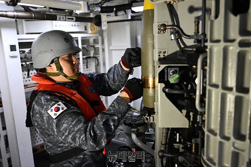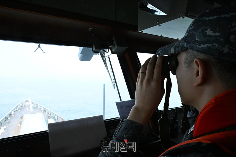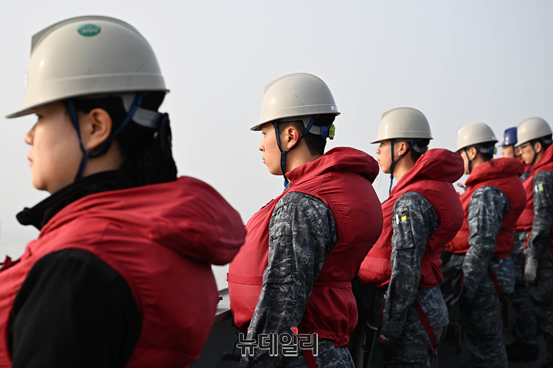 해상기동훈련이 진행중인 25일 서해 중부 해상에서 승조원들이 출항 준비를 하고 있다