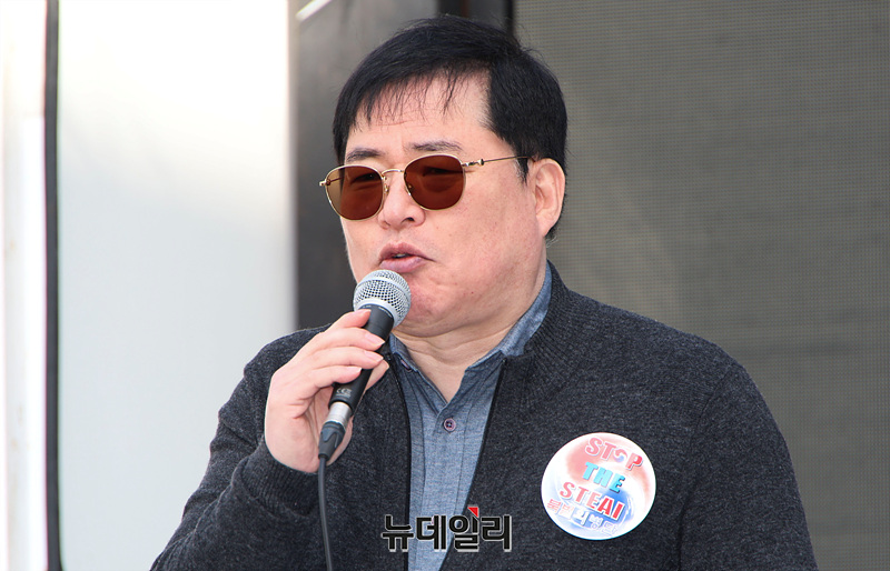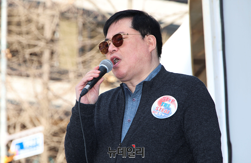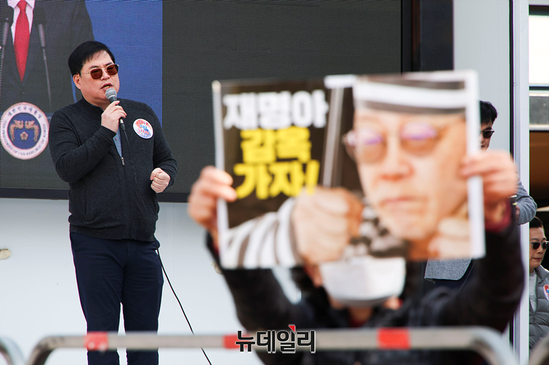 이재명 더불어민주당 대표의 공직선거법 위반 2심 선고공판을 앞둔 26일 오전 서울 서초구 서울중앙지법 앞에서 열린 '이재명 대표 구속 촉구 집회'에서 유동규 전 성남도시개발공사 기획본부장이 발언하고 있다.