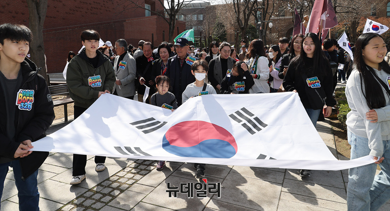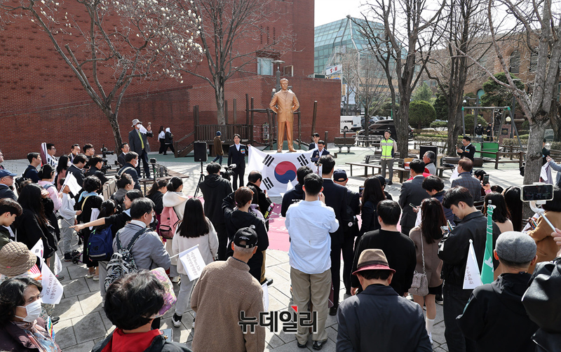 이승만 대통령 탄생 150주년을 기념해 청년이승만326플램폼이 26일 오전 서울 종로구 마로니에 공원 내 김상옥 동상앞에서 기념행사를 진행하고 있다. 이들은 행사 직후 대학로를 둘러 이화장까지 도보행진을 진행했다.