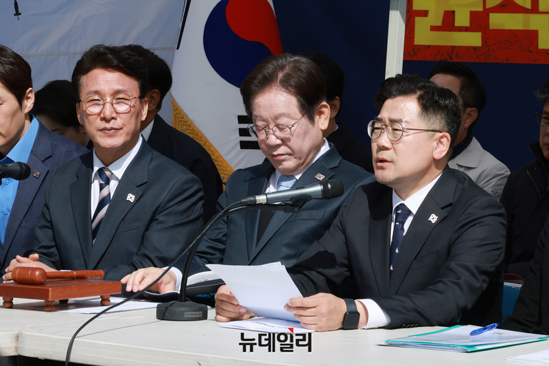 박찬대 더불어민주당 원내대표가 26일 서울 종로구 광화문 천막당사에서 열린 최고위원회의에서 모두발언을 하고 있다.