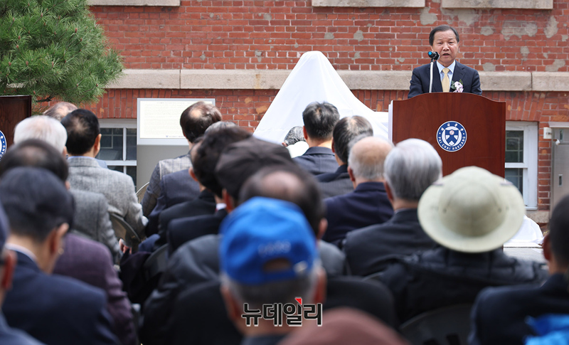조보현 배재학당 이사장이 26일 오후 서울 중구 배재학당역사박물관 앞에서 열린 이승만 대통령 탄생 150주년 기념 동상 제막식에서 인사말을 하고 있다.