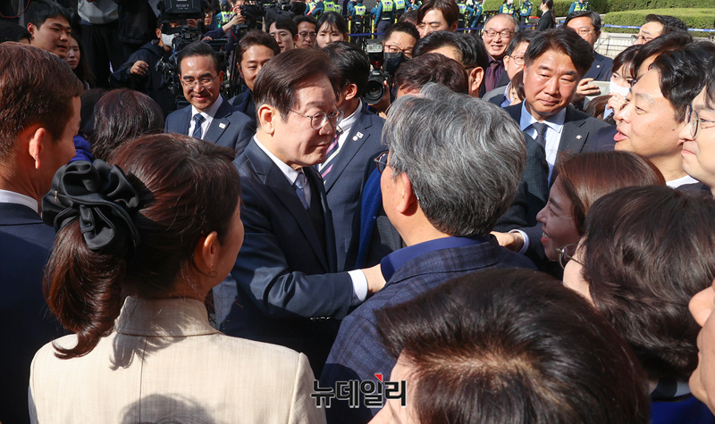 공직선거법 위반 항소심에서 무죄를 선고받은 이재명 더불어민주당 대표가 26일 오후 서울 서초구 서울고등법원에서 열린 공직선거법 위반 혐의 2심 선고 공판을 마친 뒤 의원들과 인사를 나누고 있다. (사진=공동취재단)