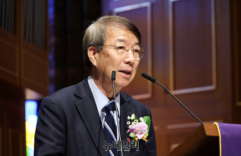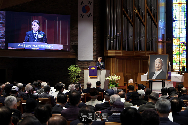 정운찬 전 국무총리가 26일 오후 서울 중구 정동제일교회에서 열린 건국대통령 우남 이승만 탄신 150주년 기념행사에서 축사를 하고 있다.