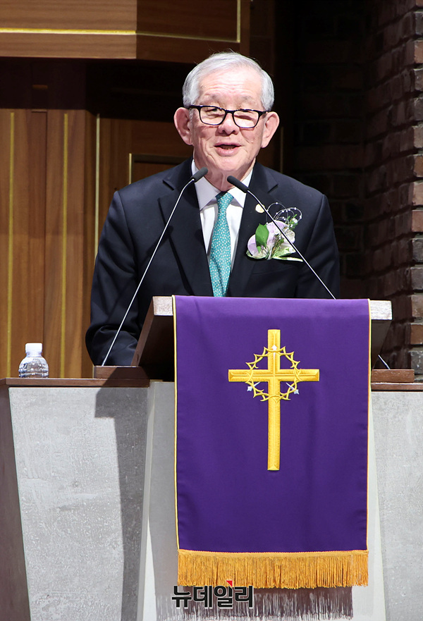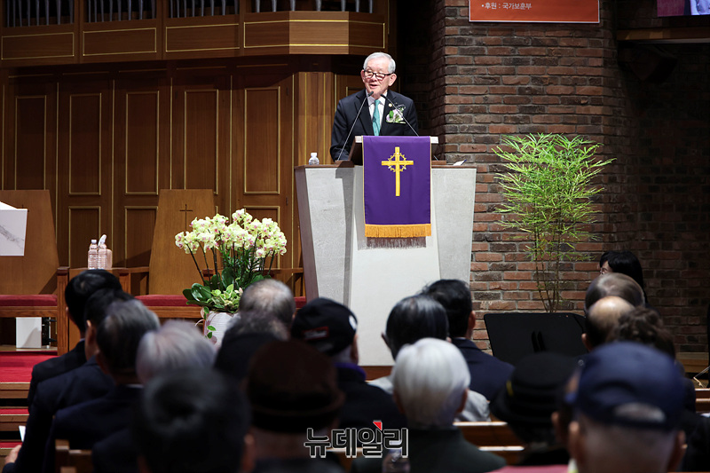 문무일 사단법인 이승만건국대통령기념사업회 사무총장이 26일 오후 서울 중구 정동제일교회에서 열린 건국대통령 우남 이승만 탄신 150주년 기념행사를 진행하고 있다.