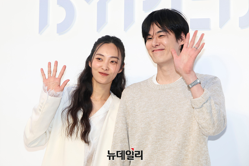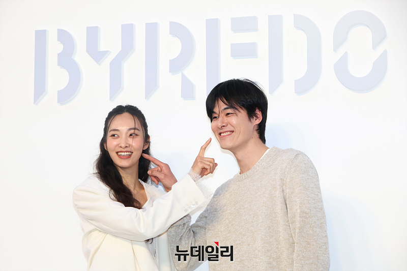 모델 곽지영, 김원중이 26일 오후 서울 성동구 XYZ 서울에서 열린 뷰티 브랜드 바이레도 팝업 전시회 '페이지 블랑쉬 서울(page blanche)' 오프닝 행사에서 포즈를 취하고 있다.