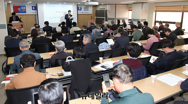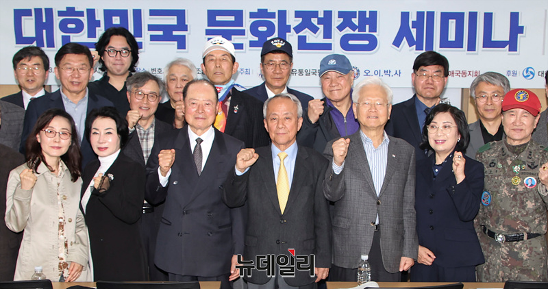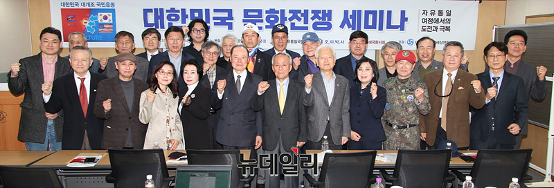 자유통일국민연합 주최 대한민국 문화전쟁 세미나가 진행중인 27일 오후 서울 중구 변호사회관에서 참석자들이 기념촬영을 하고 있다.