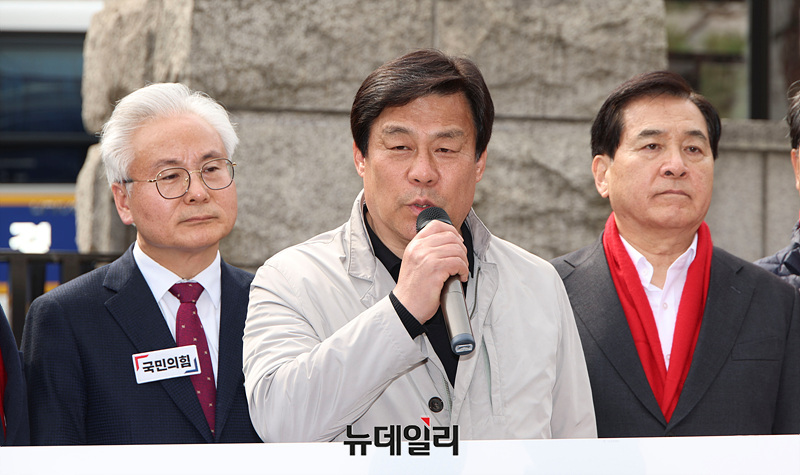 국민의힘 탄핵반대 원외위원장들이 27일 오후 서울 종로구 헌법재판소 앞에서 릴레이 기자회견을 하고 있다.