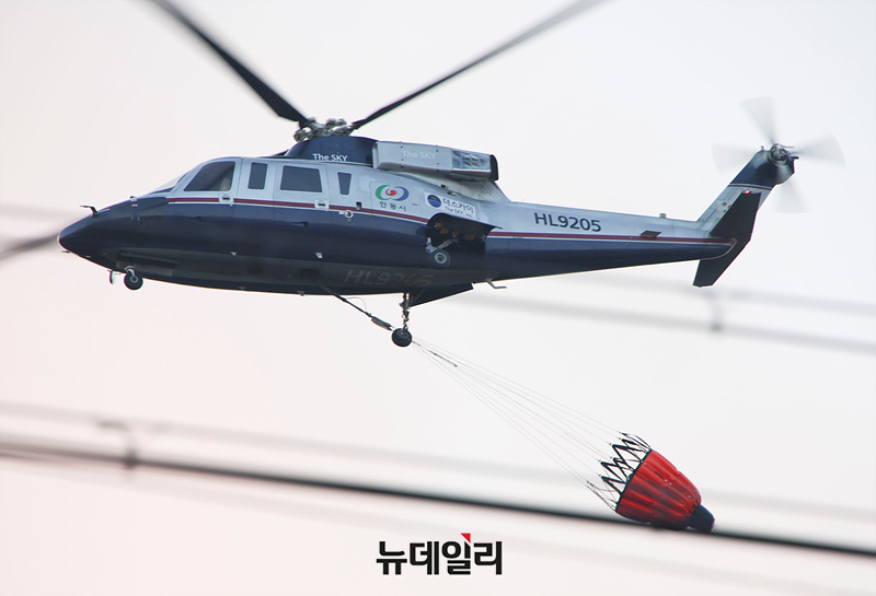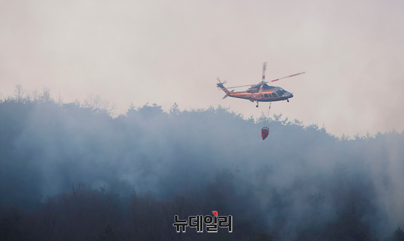 경북 북부지역 산불이 재발화한 29일 오전 경북 안동시 산불 현장에 소방헬기가 투입되고 있다.