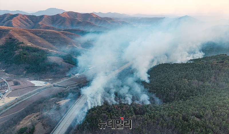 안동시 남안동 IC 인근에서 재발화해 안동 중앙고속도로 남안동IC부터 서안동 IC까지 양방향 통제중이다. (경북 의성=서성진 기자)