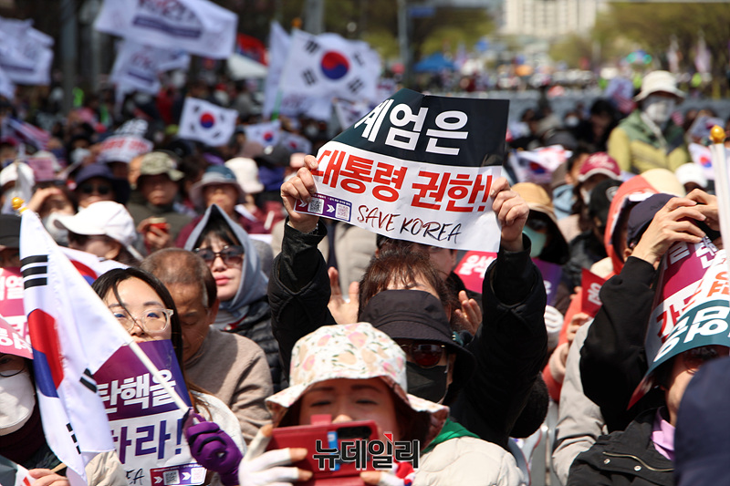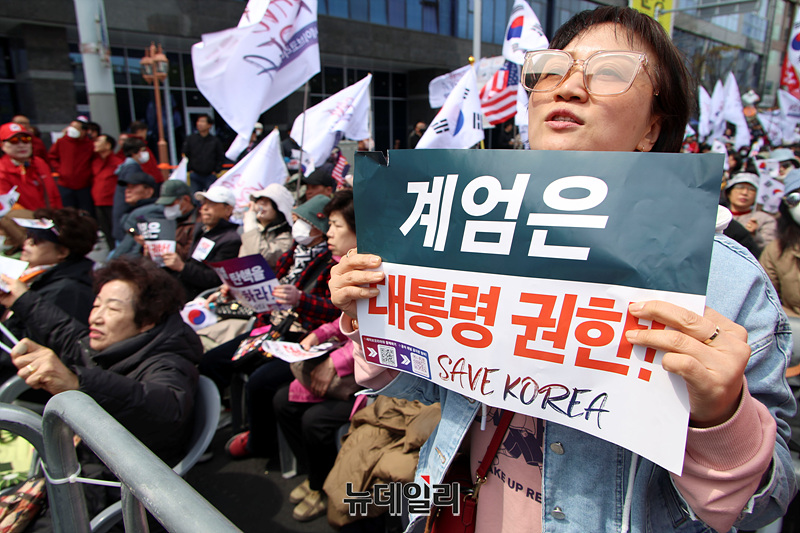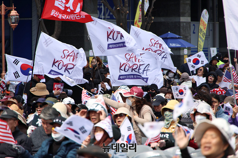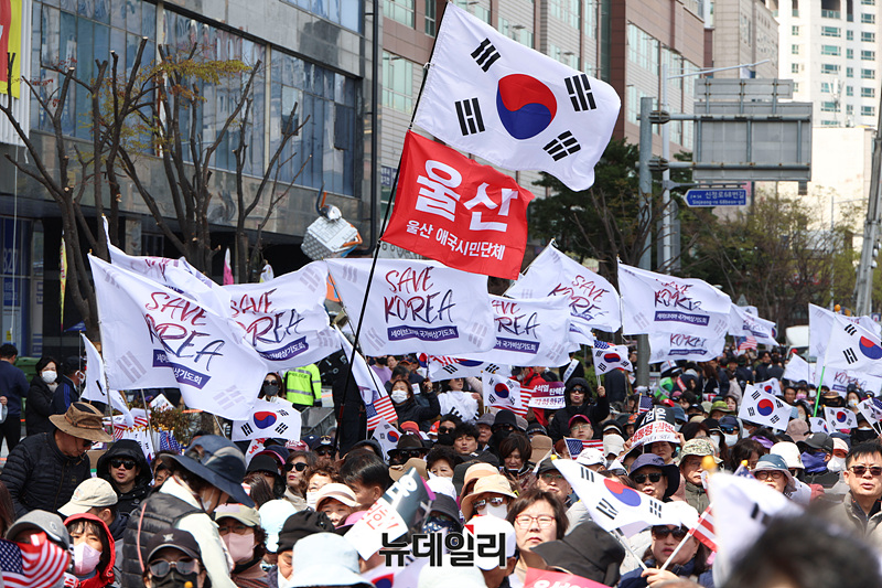 헌법재판소의 윤석열 대통령에 대한 탄핵 심판을 앞둔 29일 오후 울산 극동방송 사거리에서 윤 대통령 탄핵 반대 집회인 세이브코리아 국가비상기도회가 진행되고 있다. (울산=서성진 기자)