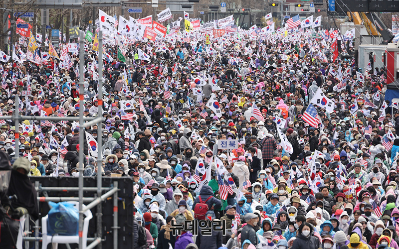 윤석열 대통령 탄핵반대 광화문 국민대회가 3월 마지막 주말인 29일 진행된 가운데 시민들이 궂은 날씨에 비옷을 입고 태극기와 성조기를 들고 탄핵반대를 외치고 있다. 세이브코리아가 주최하는 국가비상기도회는 울산을 찾아 탄핵반대를 촉구하고 있다.