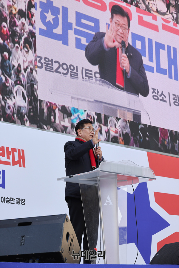 윤석열 대통령 탄핵반대 광화문 국민대회가 3월 마지막 주말인 29일 진행된 가운데 석동현 국민변호인단장이 연단에 올라 발언하고 있다.