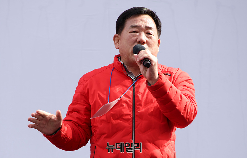 헌법재판소의 윤석열 대통령에 대한 탄핵 심판을 앞둔 29일 오후 울산 극동방송 사거리에서 열린 윤 대통령 탄핵 반대 집회인 세이브코리아 국가비상기도회에서 박성민(울산 중구) 국민의힘 의원이 발언하고 있다. (울산=서성진 기자)