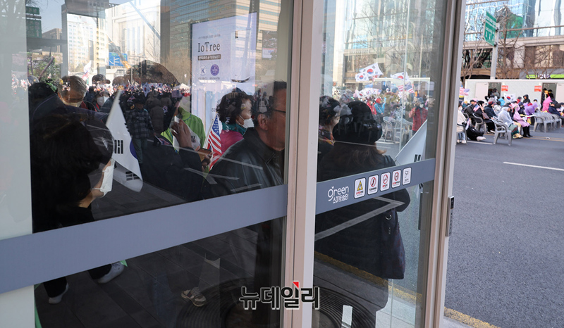 윤석열 대통령 탄핵반대 광화문 국민대회가 3월 마지막 주말인 29일 진행된 가운데 강풍에 깃발이 부러졌다. 국민대회 직후 안국역 방향으로 예정된 도보행진은 강풍으로 취소됐다. 2030 청년 집회는 안국역 5번 출구 인근에서 진행될 예정이다.