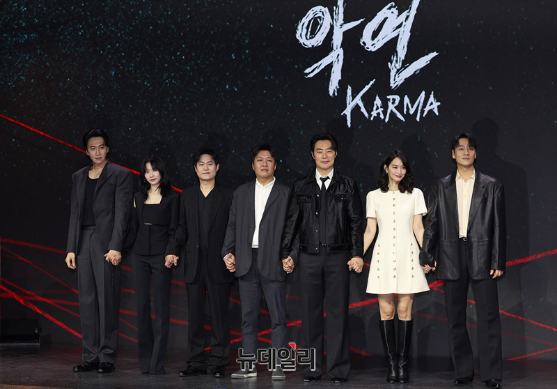 이일형 감독과 주연 배우들이 31일 오전 서울 종로구 JW 메리어트 동대문 스퀘어에서 열린 넷플릭스 시리즈 '악연(감독 극본 이일형)' 제작보고회에서 포즈를 취하고 있다.