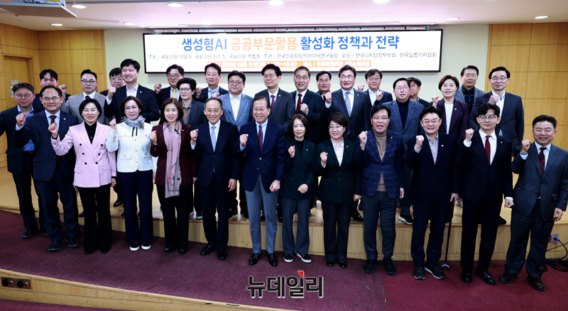 권영세 국민의힘 비상대책위원장, 이달희·최수진·박충권 의원 등 참석자들이 31일 오후 국회 의원회관에서 열린 '생성형AI 공공부문활용 활성화 정책과 전략' 토론회에서 기념촬영을 하고 있다.