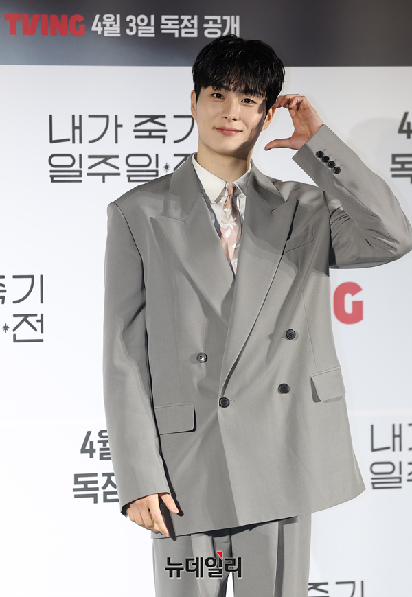 배우 정건주가 1일 오전 서울 CGV용산아이파크몰에서 열린 티빙 오리지널 '내가 죽기 일주일 전' 제작보고회에서 포즈를 취하고 있다.