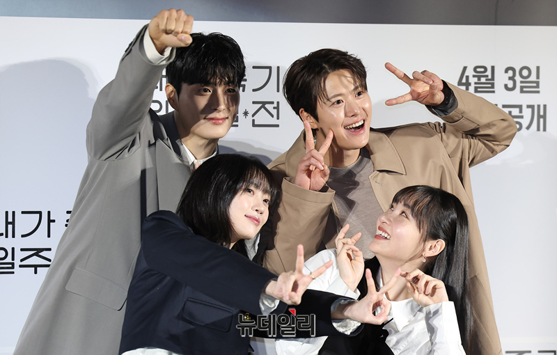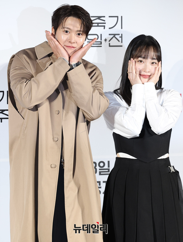 배우 공명과 김민하가 1일 오전 서울 CGV용산아이파크몰에서 열린 티빙 오리지널 '내가 죽기 일주일 전' 제작보고회에서 포즈를 취하고 있다.
