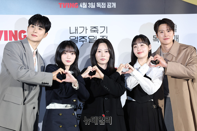 김혜영 감독과 주연배우들이 1일 오전 서울 CGV용산아이파크몰에서 열린 티빙 오리지널 '내가 죽기 일주일 전' 제작보고회에서 포즈를 취하고 있다.