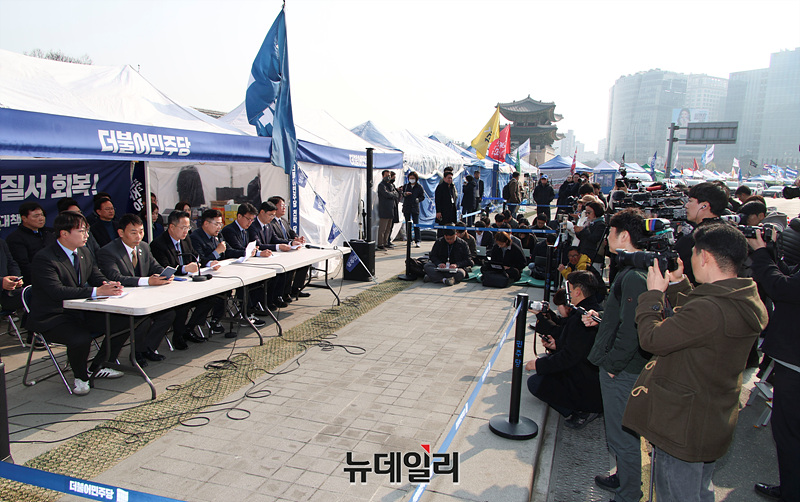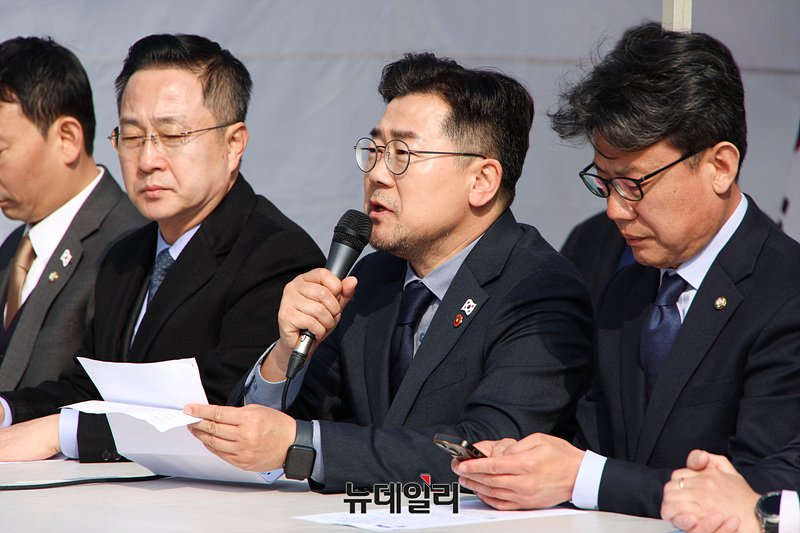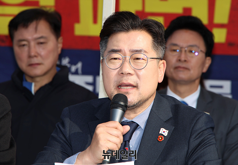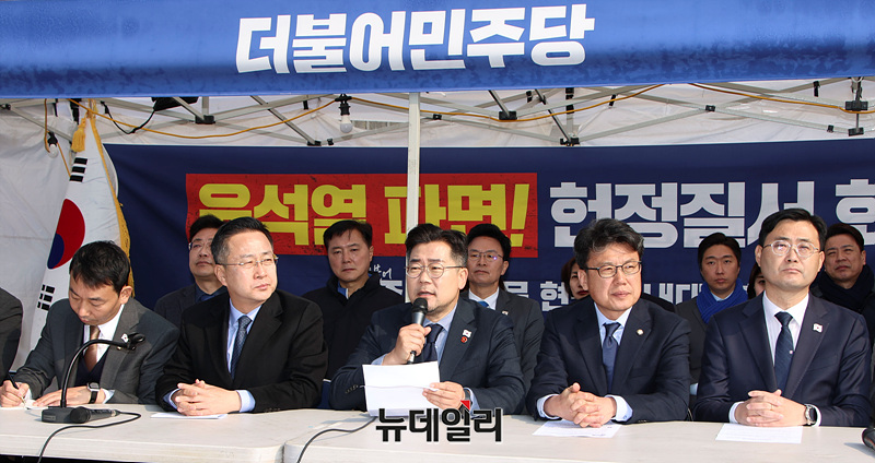 박찬대 더불어민주당 원내대표가 1일 오전 서울 종로구 광화문 천막당사에서 열린 원내대책회의에서 발언하고 있다.