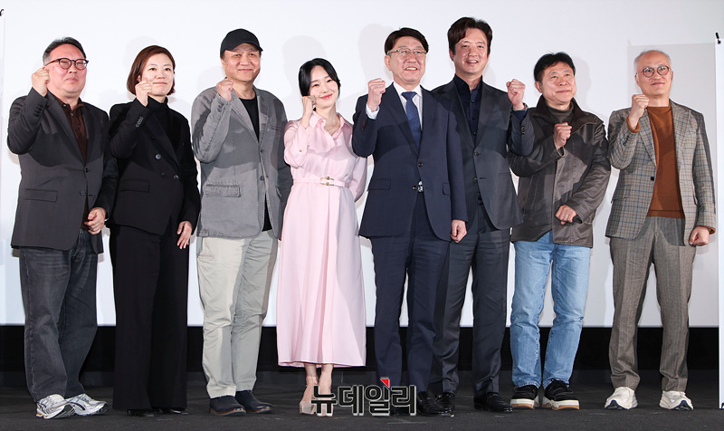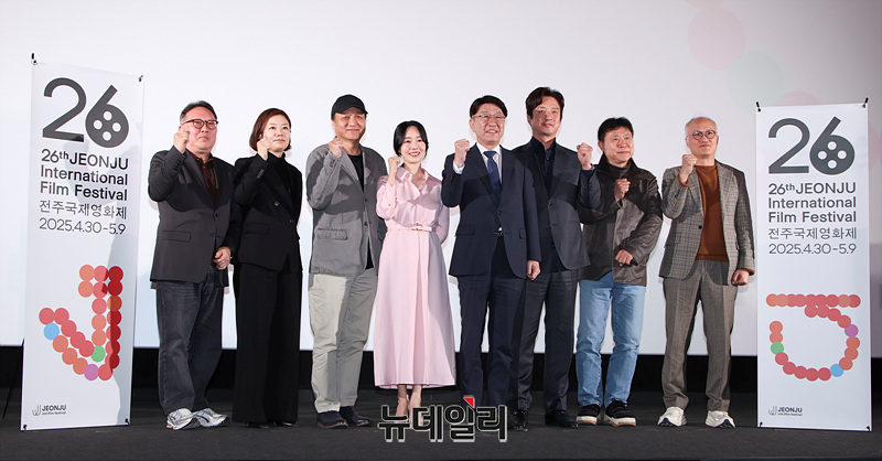 정준호 집행위원장, 우범기 조직위원장, 가수 겸 배우 이정현을 비롯한 참석자들이 1일 오후 서울 용산구 CGV용산아이파크몰에서 열린 제26회 전주국제영화제 상영작 발표 기자회견에서 기념촬영을 하고 있다.