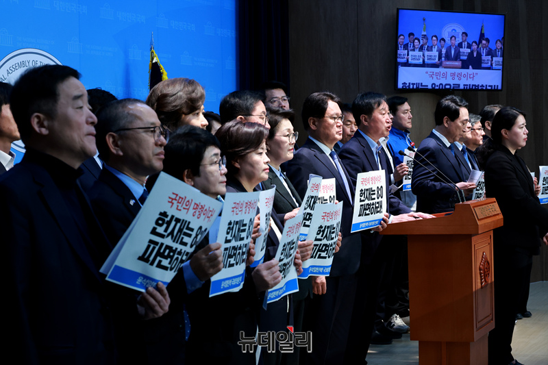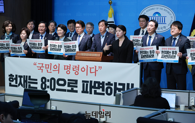 '윤석열 탄핵 국회의원 연대' 소속 야당 의원들이 2일 오전 국회 소통관에서 헌법재판소 윤석열 대통령 8:0 파면 촉구 기자회견을 하고 있다.