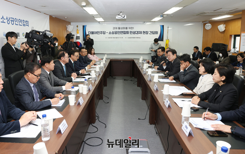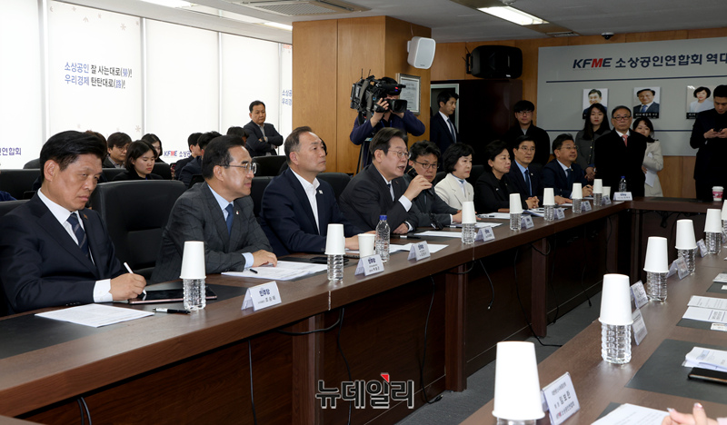 이재명 더불어민주당 대표가 2일 오후 서울 여의도 소상공인연합회 대회의실에서 열린 더불어민주당·소상공인연합회 민생경제 현장간담회에서 발언하고 있다.