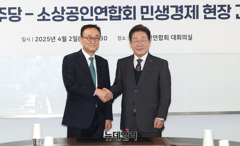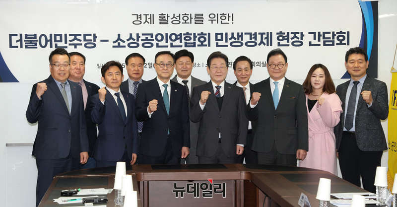 이재명 더불어민주당 대표와 송치영 소상공인연합회장 및 참석자들이 2일 오후 서울 여의도 소상공인연합회 대회의실에서 열린 더불어민주당·소상공인연합회 민생경제 현장간담회에서 기념촬영을 하고 있다.