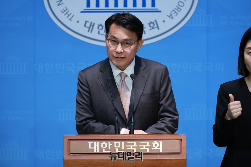 윤상현 국민의힘 의원이 3일 오전 국회 소통관에서 윤석열 대통령 탄핵심판 현안관련 기자회견을 하고 있다.