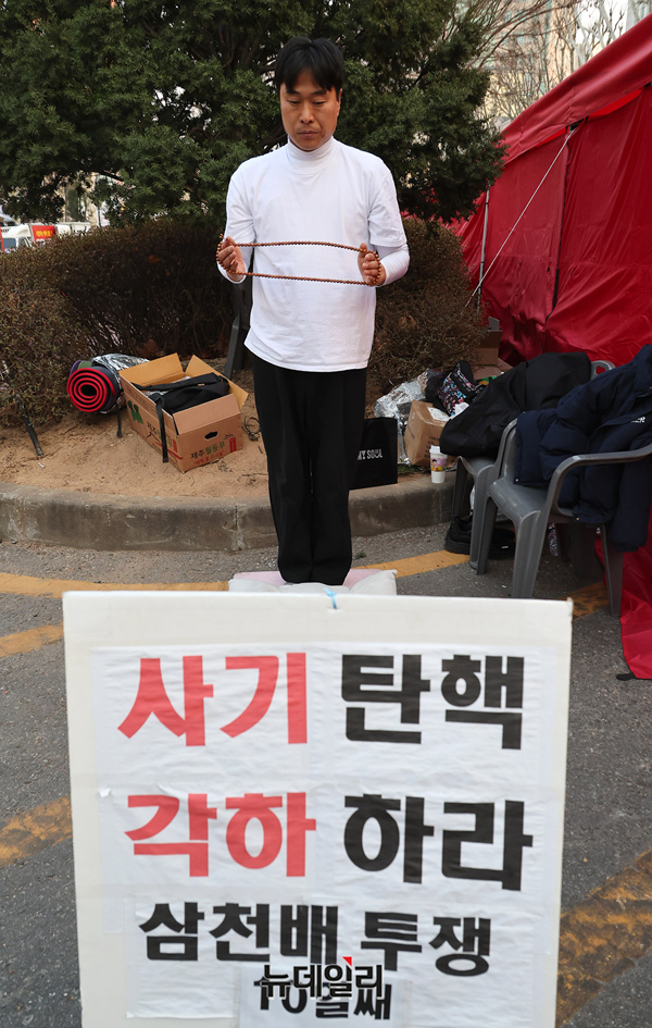 헌법재판소의 윤석열 대통령 탄핵심판 선고을 하루 앞둔 3일 오후 서울 종로구 안국역 인근에서 이종배 서울시의원이 탄핵반대 촉구 10번째 삼천배 투쟁을 이어가고 있다.