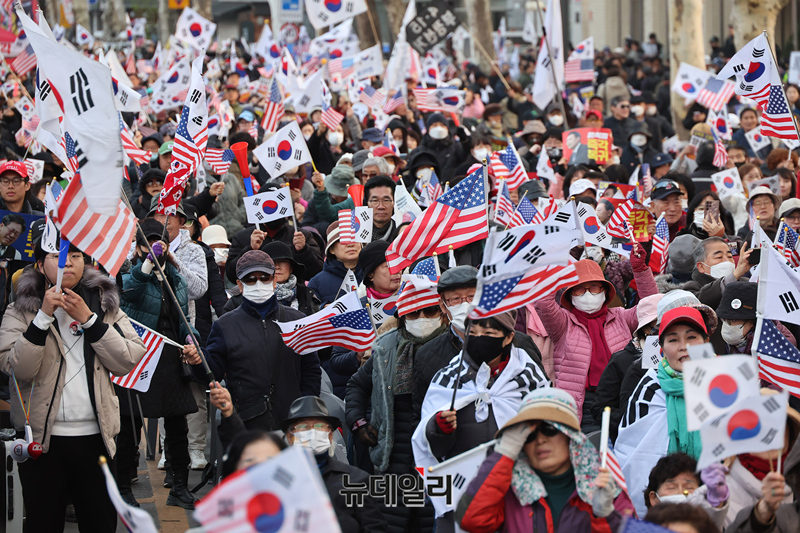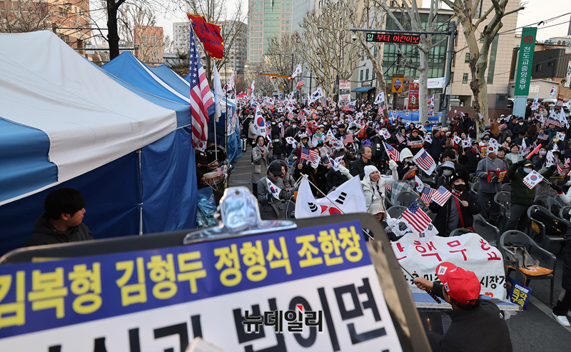 [포토] 탄핵반대 밤샘집회 이어가는 시민들... 밤10시부터 동화면세점서 계속