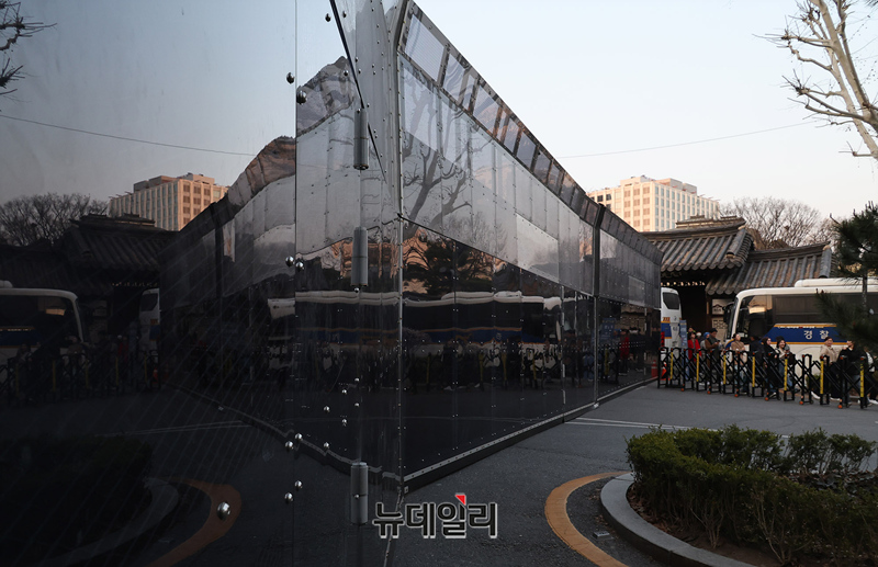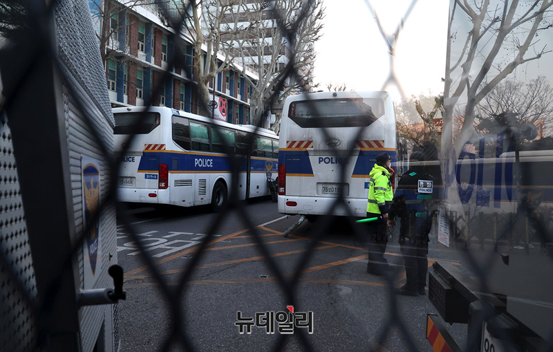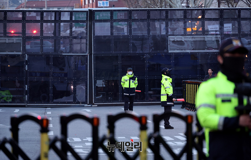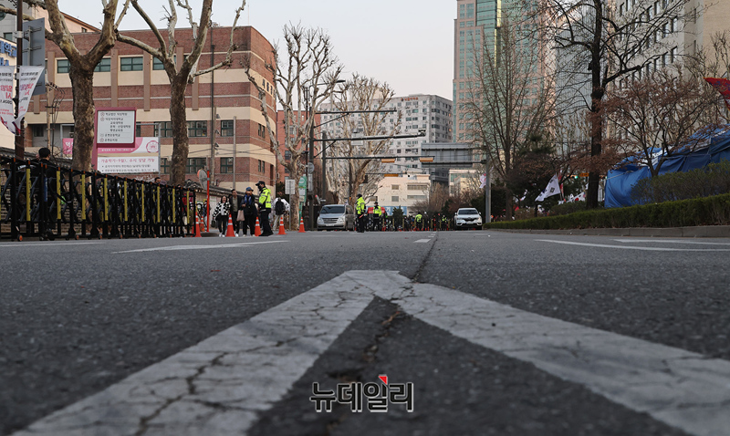 헌법재판소의 윤석열 대통령 탄핵심판 선고을 하루 앞둔 3일 오후 서울 종로구 안국역 인근에 폴리스라인이 설치돼 있다. 경찰은 을호비상을 발령했다. 심판 당일은 갑호비상으로 격상 될 예정이다.