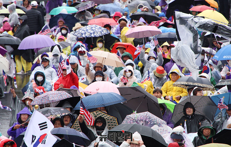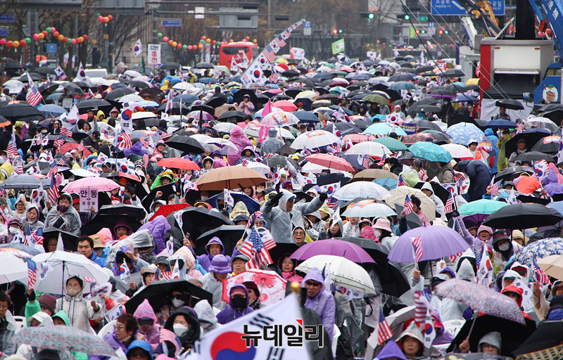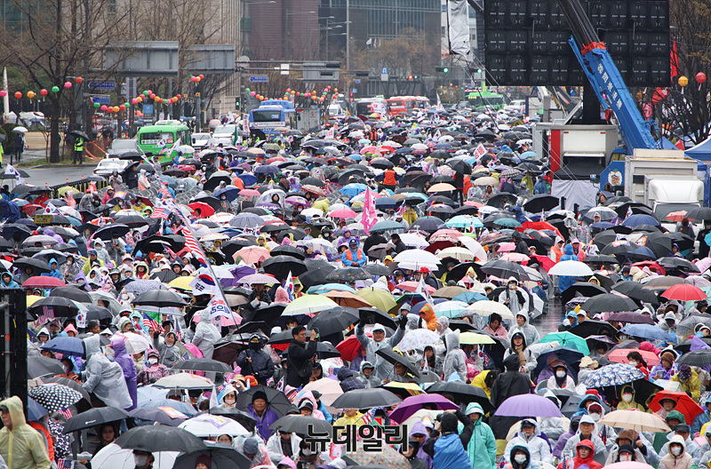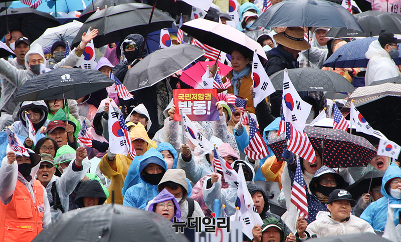 윤석열 대통령이 헌법재판관 만장일치로 파면된 가운데 5일 오후 서울 광화문광장에서 열린 대한민국바로세우기국민운동본부(대국본)와 자유통일당이 주최한 '국민저항권 광화문 국민대회'에서 탄핵인용 결정에 반대하는 시민들이 모여 구호를 외치고 있다.