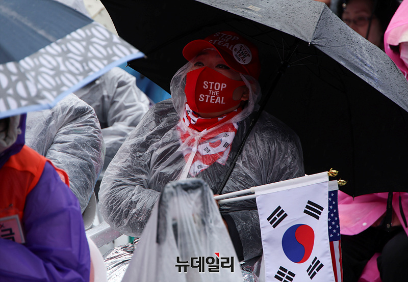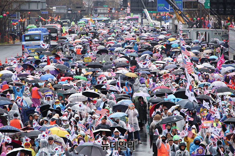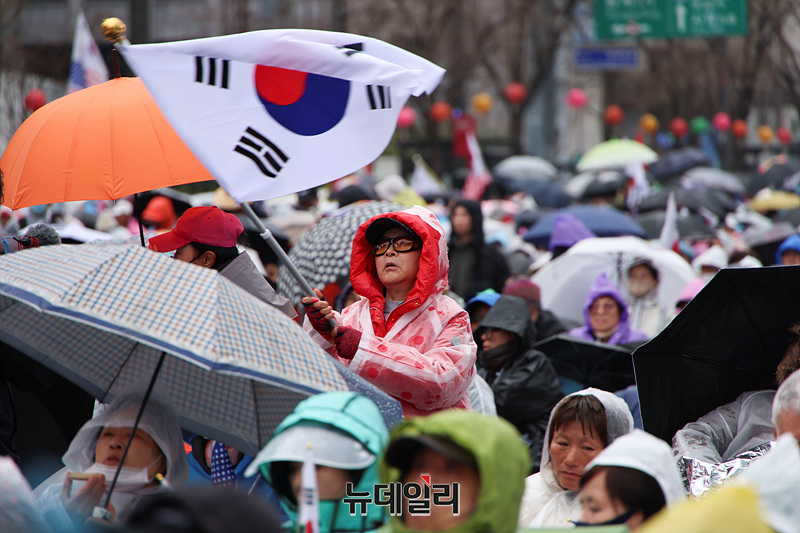 [포토] 비 내리는 광화문서 울려퍼지는 '탄핵인용 반대' 목소리