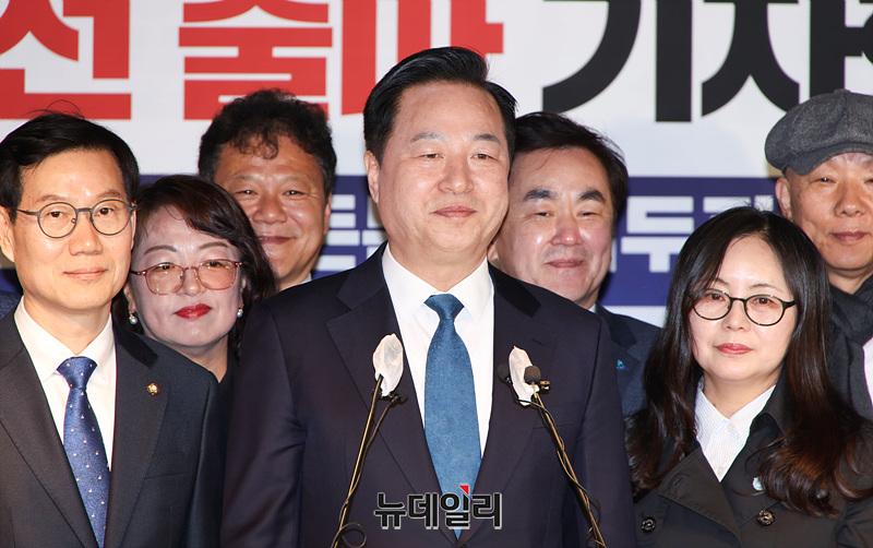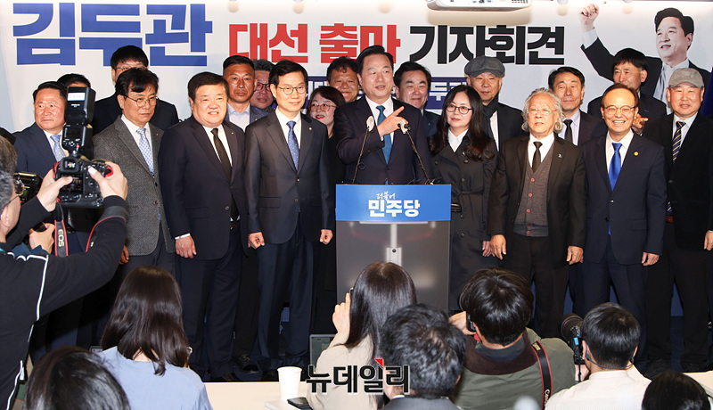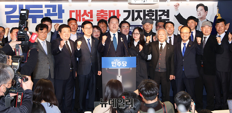 김두관 전 더불어민주당 의원이 7일 오전 서울 여의도 민주당사에서 제21대 대통령 선거 출마 기자회견에 앞서 기념촬영을 하고 있다.