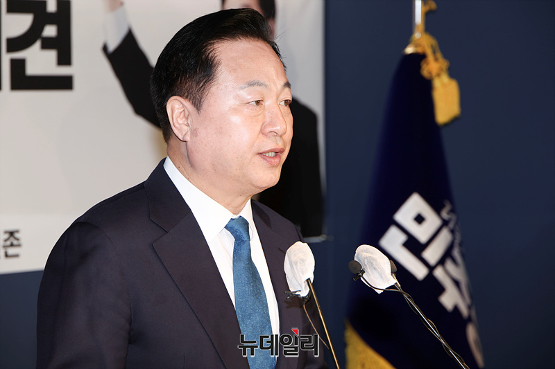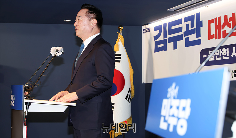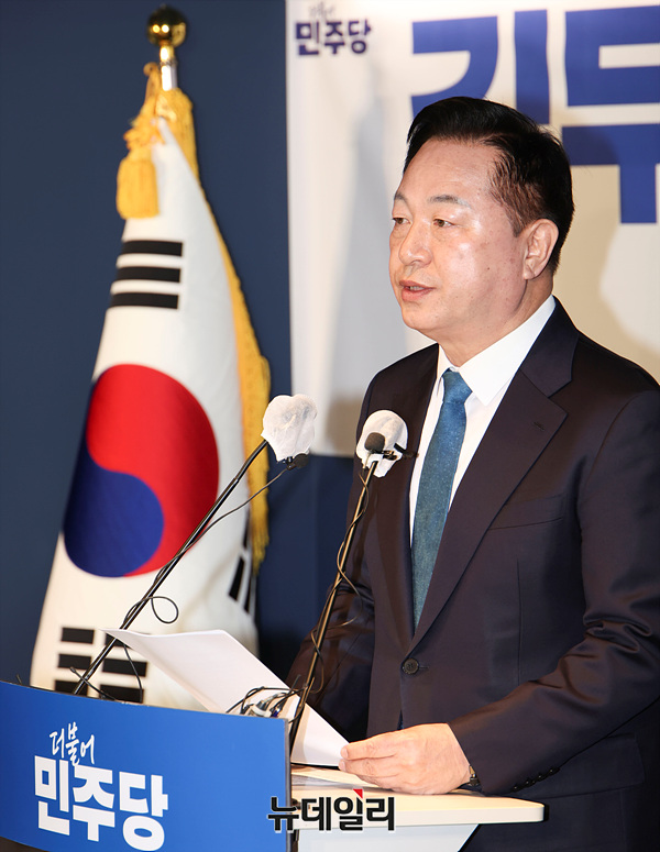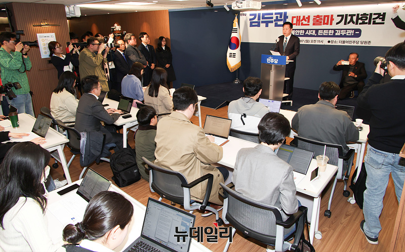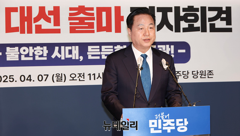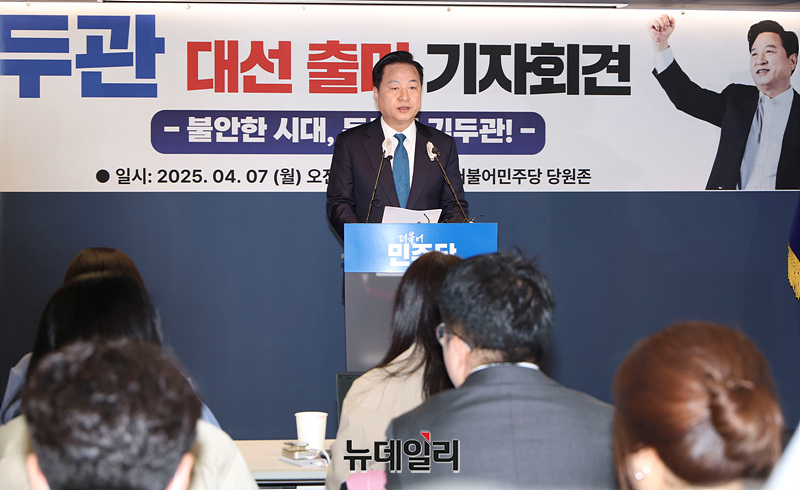김두관 전 더불어민주당 의원이 7일 오전 서울 여의도 민주당사에서 제21대 대통령 선거 출마 기자회견을 하고 있다.