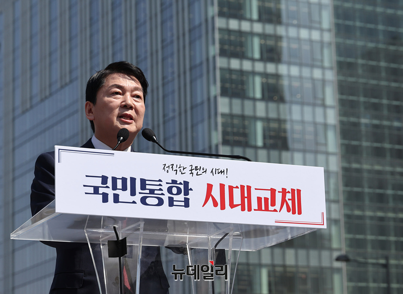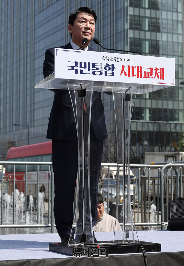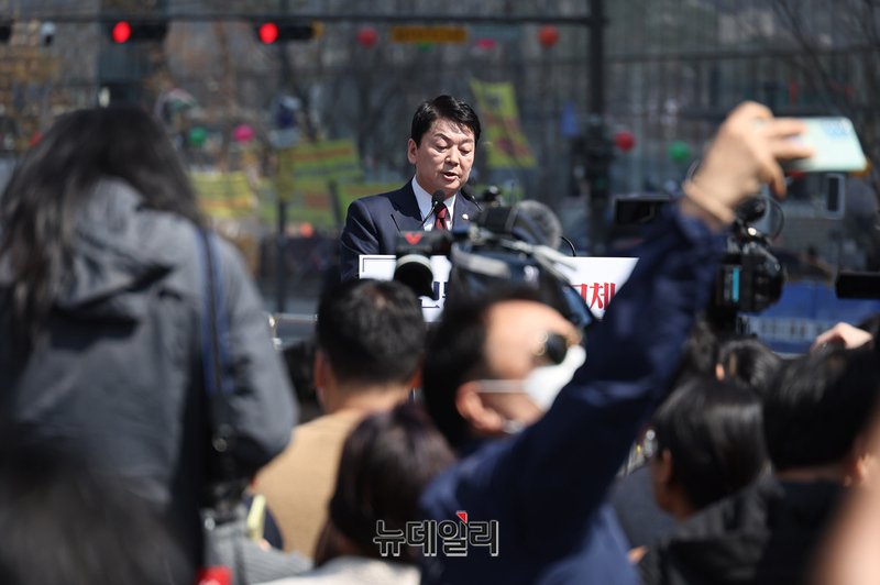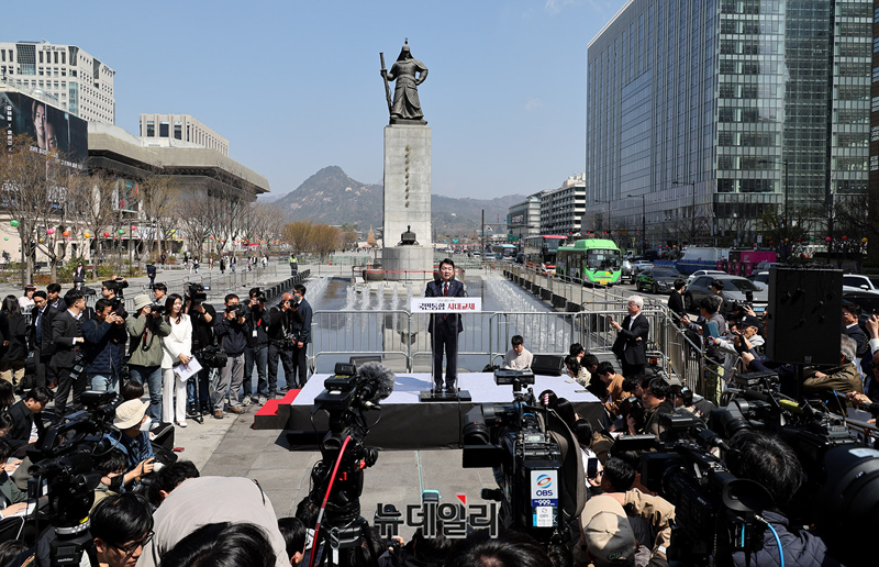 안철수 국민의힘 의원이 8일 오전 서울 광화문광장 이순신동상 앞에서 제21대 대통령 선거 출마 선언을 하고 있다.