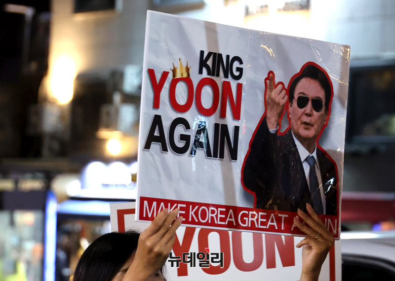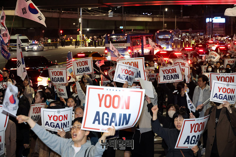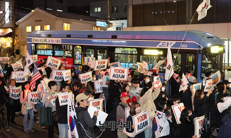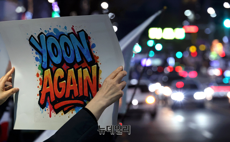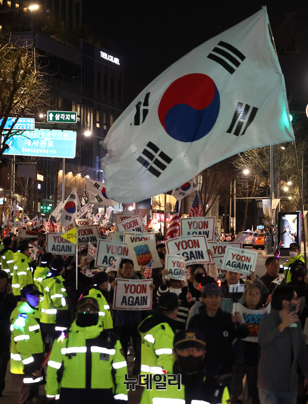 윤석열 대통령 탄핵을 반대하는 자유대학 청년들이 8일 밤 이태원역에서 한남동 대통령 관저까지 'YOON AGAIN(윤 어게인)' 손피켓을 들고 행진을 하고 있다.