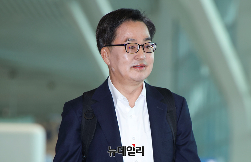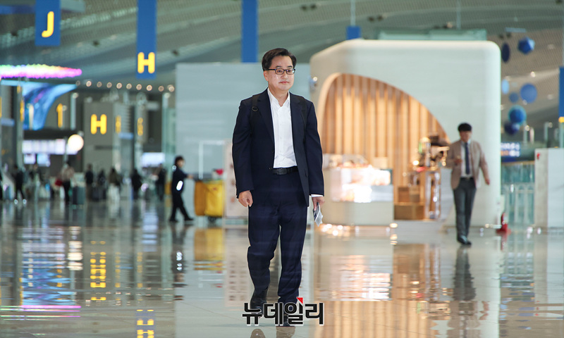 김동연 경기도지사가 9일 오전 인천국제공항 제2터미널에서 제21대 대통령 선거 출마 선언 기자회견을 위해 이동하고 있다. (인천=서성진 기자)