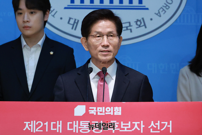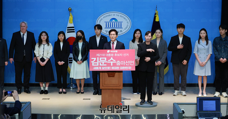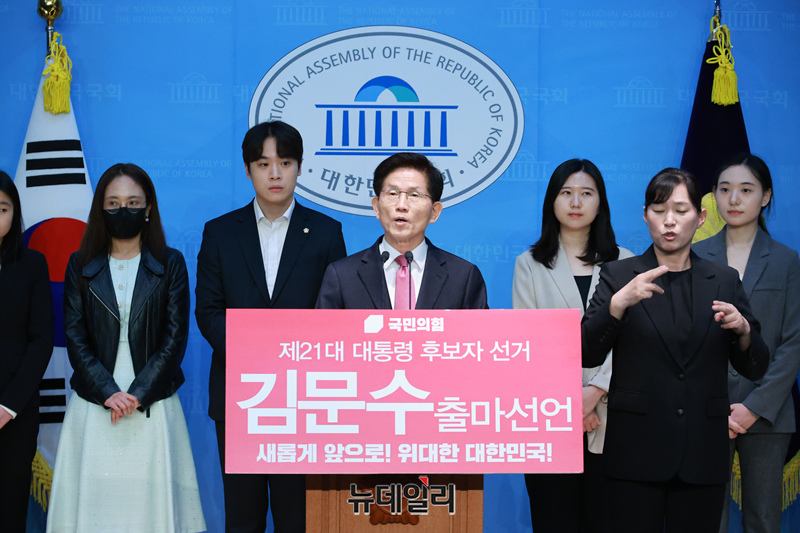 김문수 전 고용노동부 장관이 9일 오전 소통관에서 21대 대통령 선거 출마 선언 기자회견을 하고 있다.