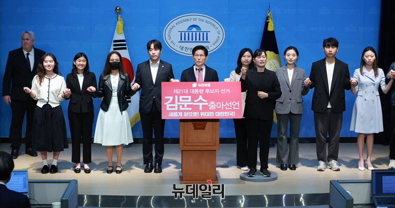 김문수 전 고용노동부 장관이 9일 오전 국회에서 대선출마 선언을 하며 청년들과 손을 잡고 있다.