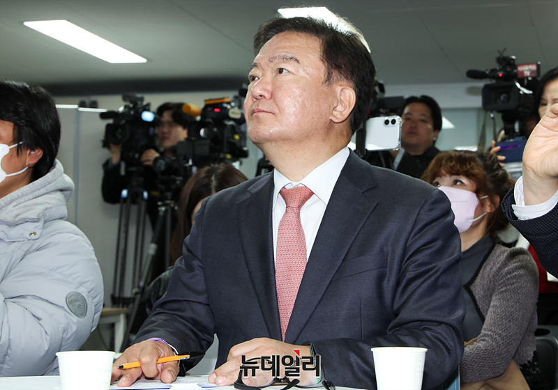 민경욱 전 국민의힘 의원이 9일 오전 서울 용산구 황교안 비전캠프에서 열린 '국민의힘 탈당·제21대 대통령 선거 출마' 기자회견에 참석해 자리하고 있다.