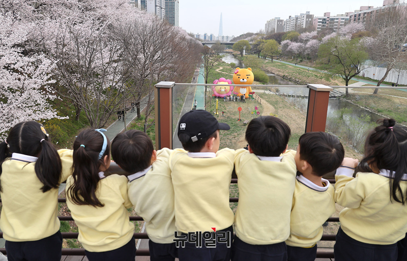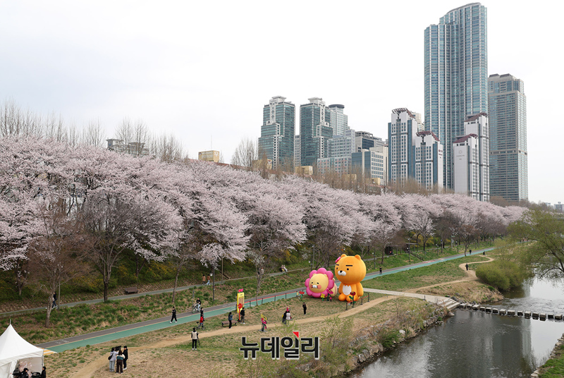[포토] 벚꽃 만개한 양재천에 등장한 라이언-춘식이