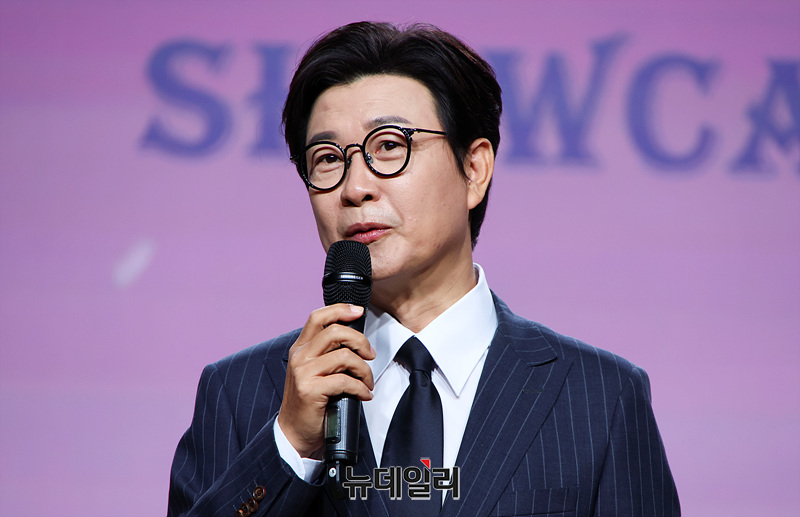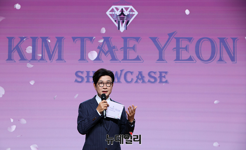 MC 김성주가 9일 오후 서울 강남구 일지아트홀에서 열린 정규앨범 '설레임' 발매 기념 쇼케이스에서 트로트 가수 김태연을 소개하고 있다.