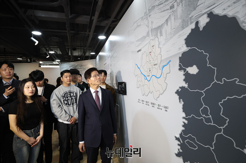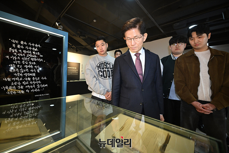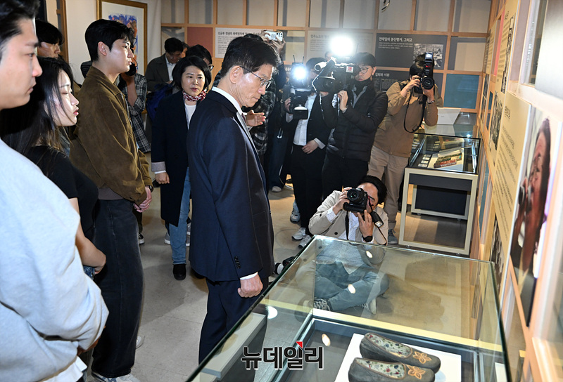 제21대 대선 출마를 선언한 김문수 전 고용노동부 장관이 10일 오전 서울 종로구 전태일기념관에서 열린 '청년과 함께하는 전태일기념관' 행사에서 청년들과 전시관을 둘러보고 있다.