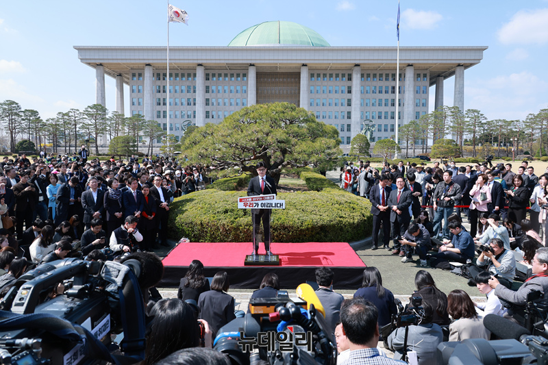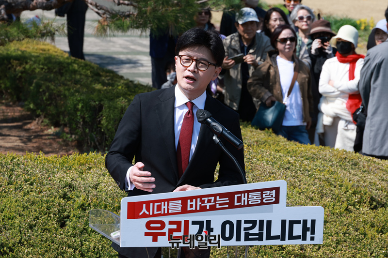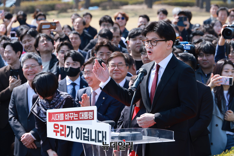 한동훈 국민의힘 전 대표가 10일 오후 국회 분수대 앞에서 기자회견을 열고 제21대 대통령선거 출마 선언을 하고 있다.
