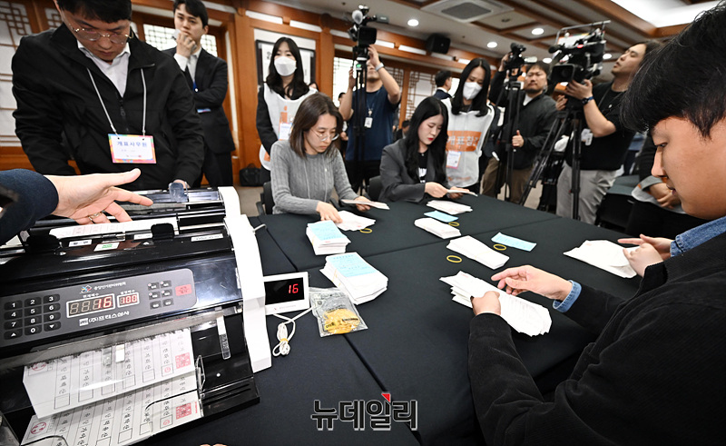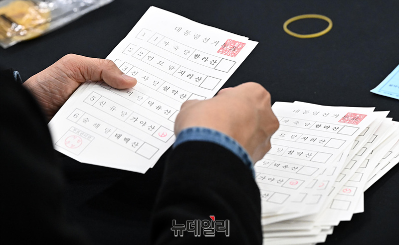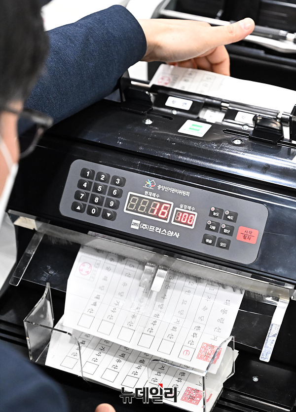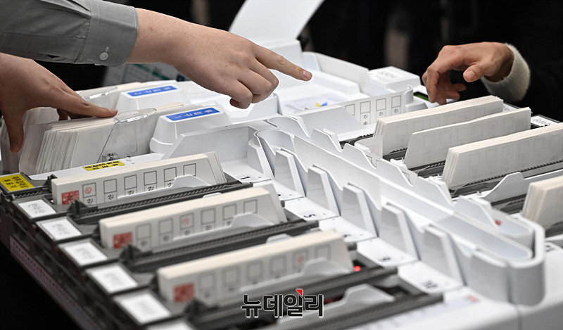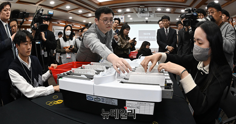 제21대 대통령 선거를 앞둔 10일 오후 경기 과천시 중앙선거관리위원회에서 열린 제21대 대통령선거 투·개표 시연회에서 선관위 관계자가 수개표 과정을 시연하고 있다. (경기 과천=서성진 기자)