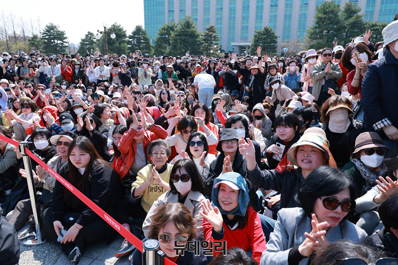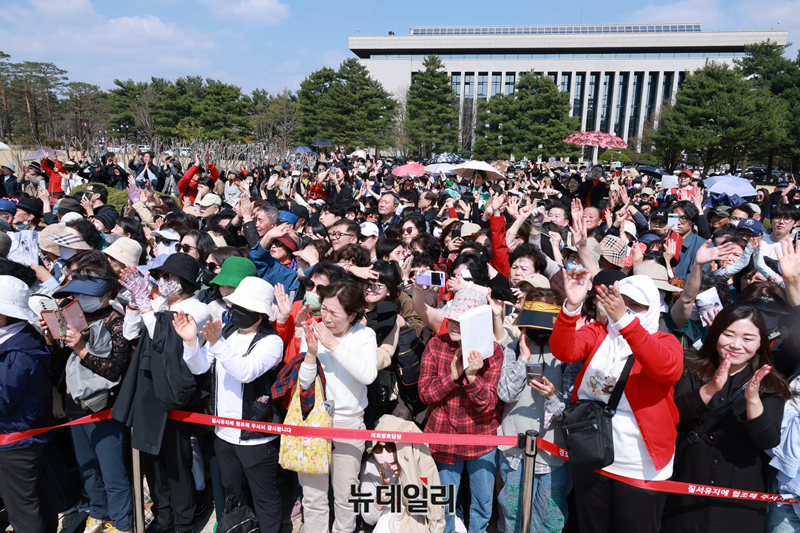 한동훈 국민의힘 전 대표가 10일 오후 국회 분수대 앞에서 기자회견을 열고 제21대 대통령선거 출마 선언을 하고 있는 가운데 지지자들이 환호하고 있다.