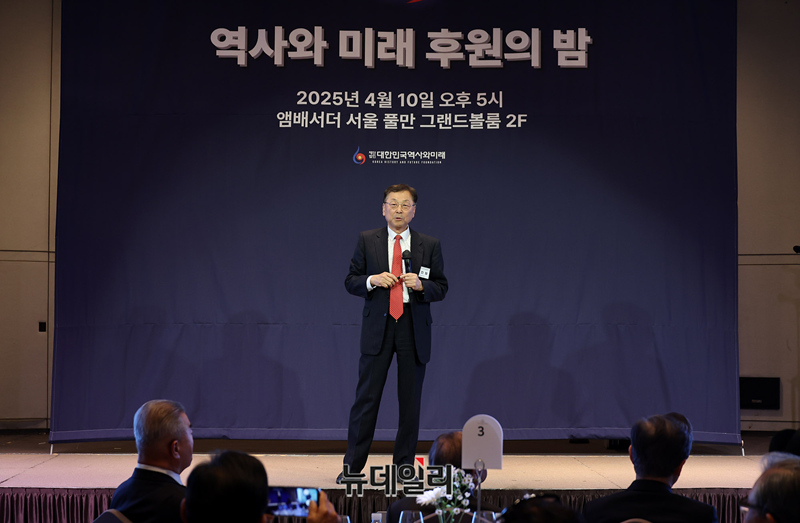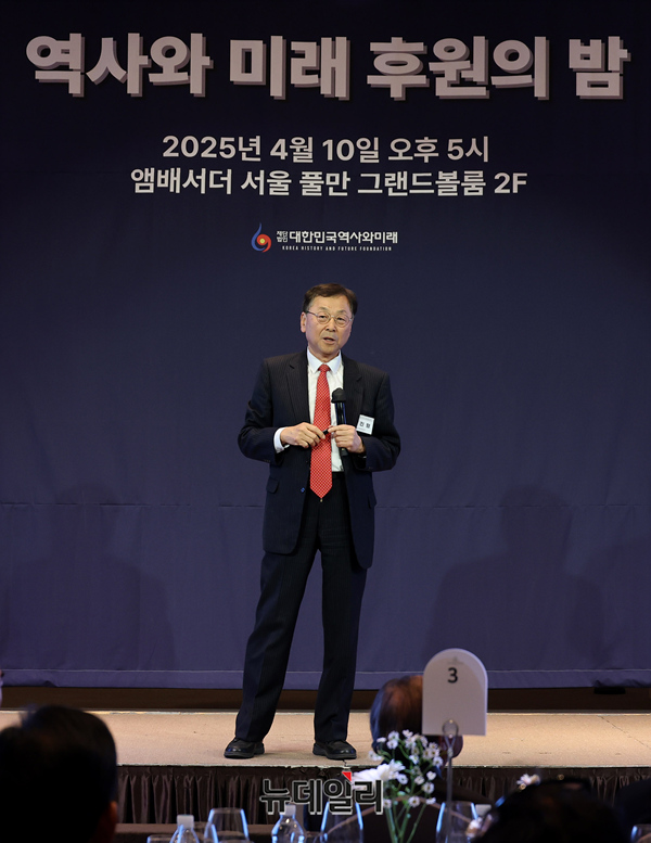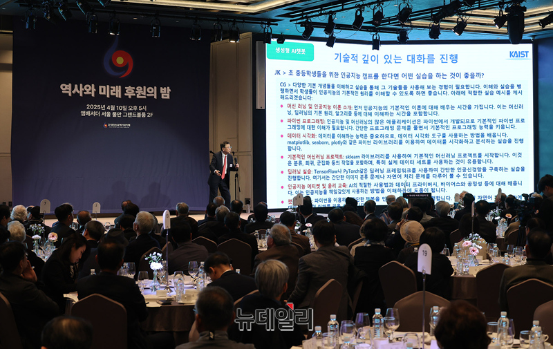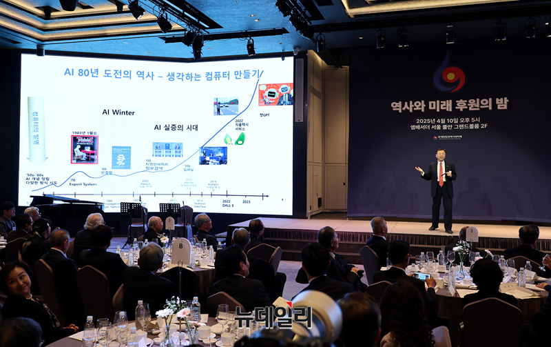 김진형 카이스트 명예교수가 10일 오후 서울 중구 앰버서더 서울 풀만에서 열린 재단법인 '대한민국 역사와 미래' 후원의 밤 행사에서 AI가 가져올 미래를 주제로 강연하고 있다.